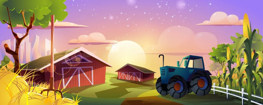 Download: Farming landing page. Agricultural farm with barns, tractor, corn fields and hay. Growing organic products, agribusiness, farmland, harvesting web banner background. Cartoon vector illustration.