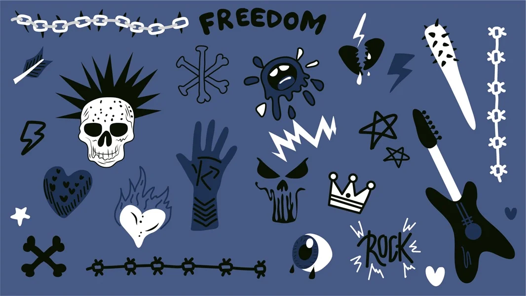 Download free: Punk graffiti elements set design. Collection with scribble skulls, chains, bones, yelling mouth, heart break, lightnings, spiked bat, electric guitar, stars, barbed wire, more. Vector illustration.