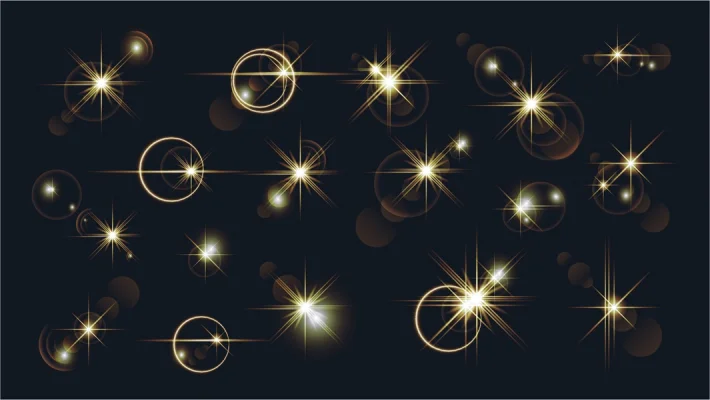 Download free: Golden lens flares elements set design. Collection with glowing light effect, rounded explosion with sparks and stars, twinkling radiant shimmer, sunlight halo with glimmer. Vector illustration.