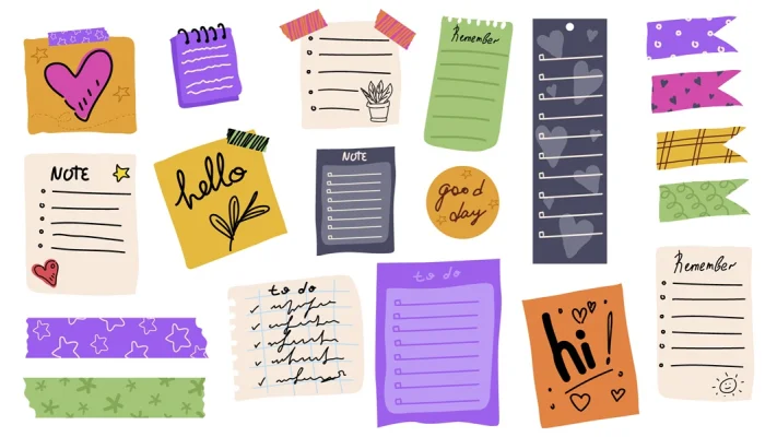 Download free: Doodle paper notes elements set design. Collection with sticky notes with cute scribbles, schedule lists, colourful reminder stationery with adhesive tapes, school memo pads. Vector illustration.