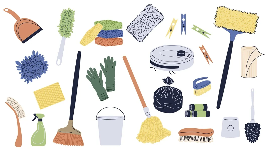 Download free: Cleaning equipment elements set design. Collection with dustpan, brushes, sponges, scrapers, clothespin, paper towel, mop, rubber gloves, garbage bag, detergent spray, bucket. Vector illustration.