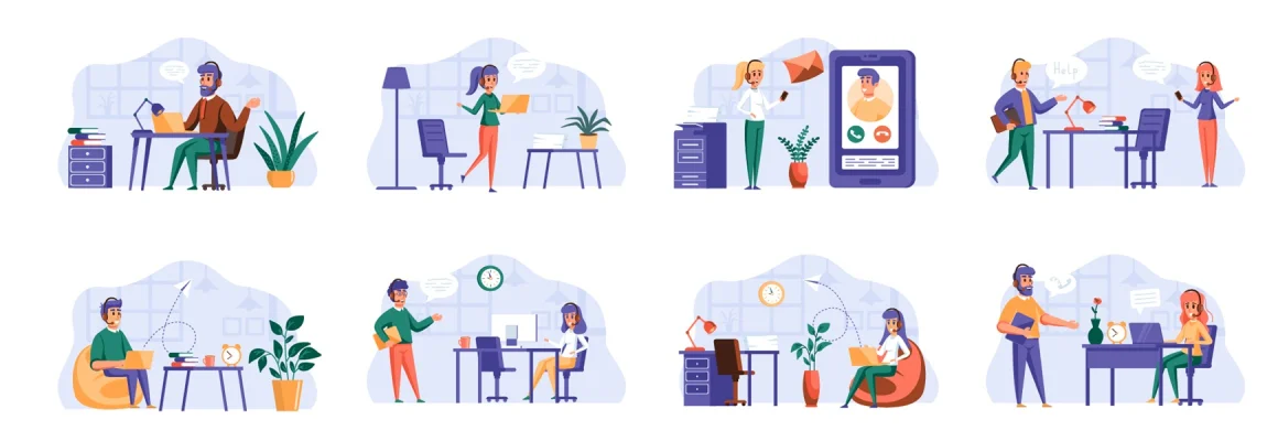 Download free: Support service scenes bundle with people characters. Customer support operator with hands-free headset working situations. Online consultation and assistance in call center flat vector illustration.
