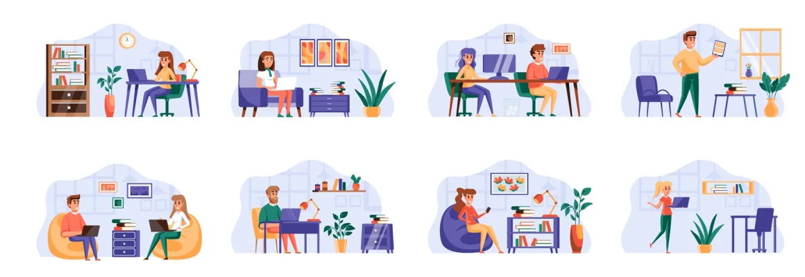 Download free: Coworking office bundle with people characters. Designers and developers communicate and working together in coworking space situations. Employees and freelancers at workplace flat vector illustration.