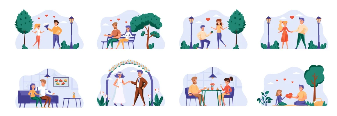 Download free: Love couple bundle with people characters. Happy Valentines Day in park, date in caffe, man proposing girl to marry, wedding ceremony situations. Romantic relationship flat vector illustration.