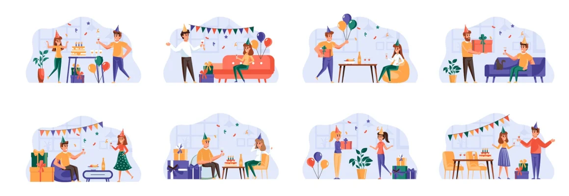 Download free: Party scenes bundle with people characters. Friends drinking and having fun together, congratulating and presenting gifts situations. Birthday party with festive decoration flat vector illustration.