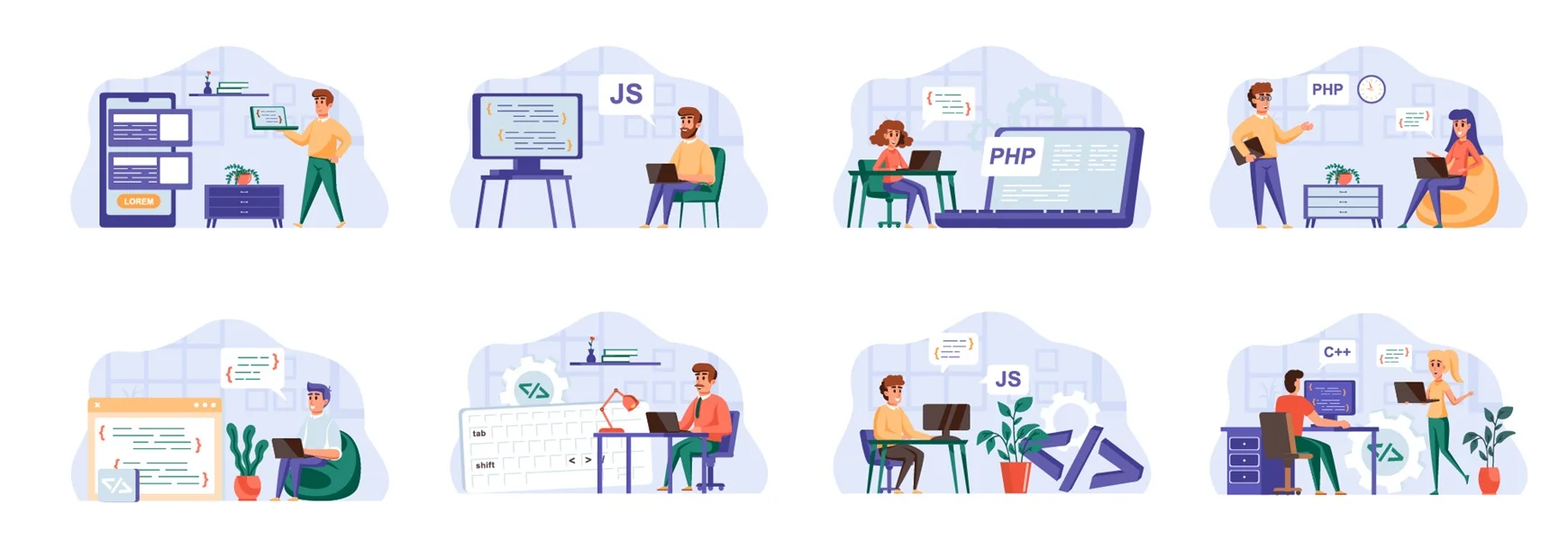 Download free: Programming scenes bundle with people characters. Frontend and backend developers team working in office, web design and software engineering situations. Programs development flat vector illustration.