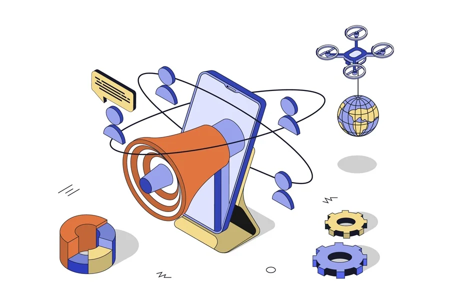 Download free: Referral marketing 3d isometric concept in isometry design for web. Advertising program strategy of loyalty audience creating with refer friends and online megaphone announcement. Vector illustration.