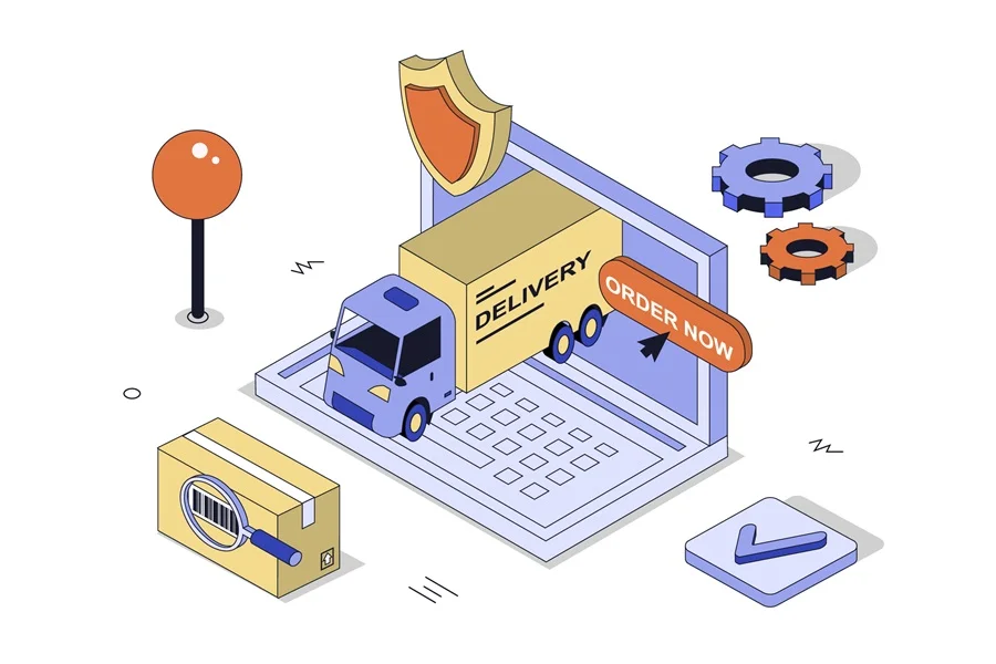 Download free: Safe delivery 3d isometric concept in isometry design for web. Truck shipping logistic, express freight and global transportation to warehouse, tracking parcel package service. Vector illustration.