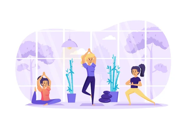 Download free: Women doing yoga asanas in studio scene. Young girls do balance and flexibility exercises in class. Healthy lifestyle, sport activity concept. Vector illustration of people characters in flat design.