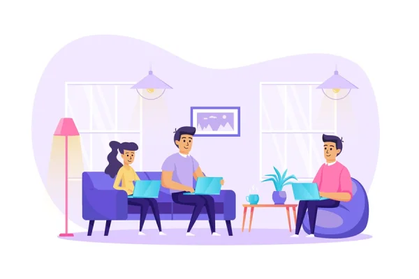 Download free: Freelance work from home office concept. Men and woman working distant on laptops sitting in comfortable living room scene. Remote workers. Vector illustration of people characters in flat design.