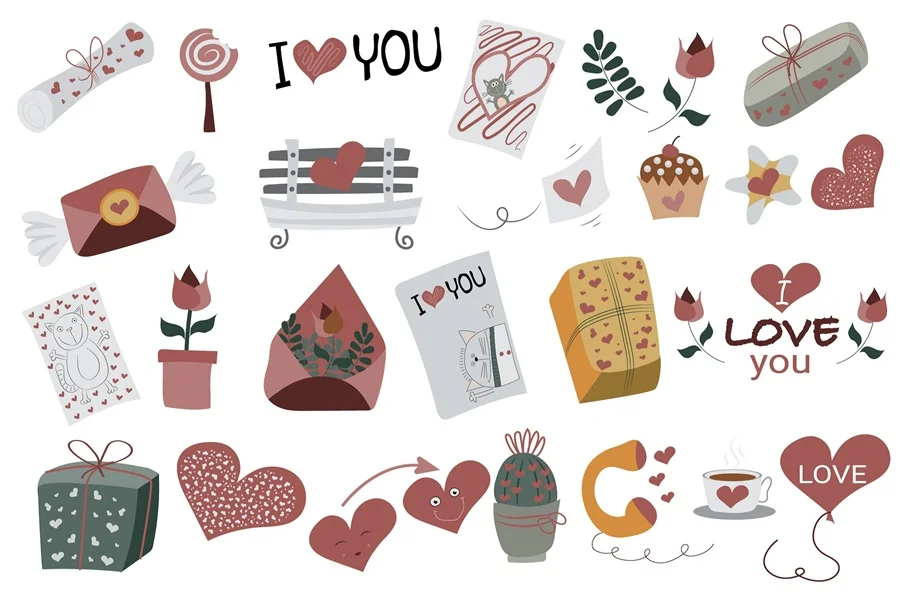Download free: Valentines Day isolated elements set. Bundle of holiday decor, romantic letters, love hearts, flowers, gifts, dating bench, cakes and other. Creator kit for vector illustration in flat cartoon design.