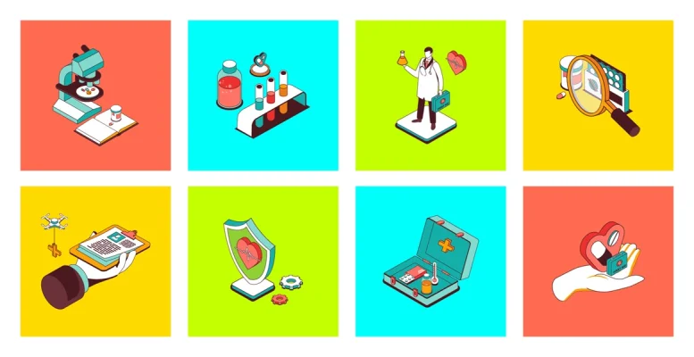 Download free: Medicine concept of 3d isometric icons set. Pack with laboratory microscope tests, pharmacy research, consultation with doctor, heart diagnosis, first aid kit and treatment. Vector illustration.