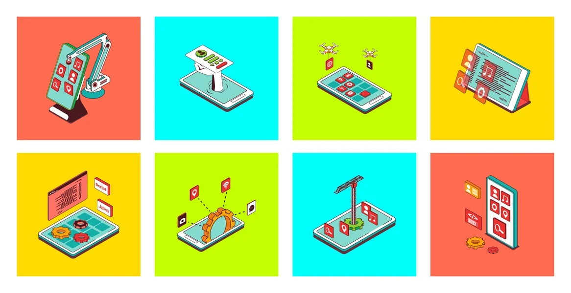 Download free: App development concept of 3d isometric icons set. Pack with programming applications process, creating mobile interface layouts, testing accessibility, optimization. Vector illustration.