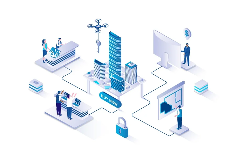 Download free: Real estate 3d isometric concept with isometry people design for web. Realtor company selling new apartments and flats with blueprint projects, making contracts with buyers. Vector illustration.