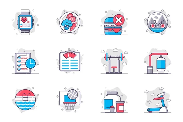 Download free: Fitness concept flat line icons set. Healthy lifestyle and sports activity. Bundle of diet, bike, barbell, punching bag, pool, basketball, other. Vector conceptual pack outline symbols for mobile app