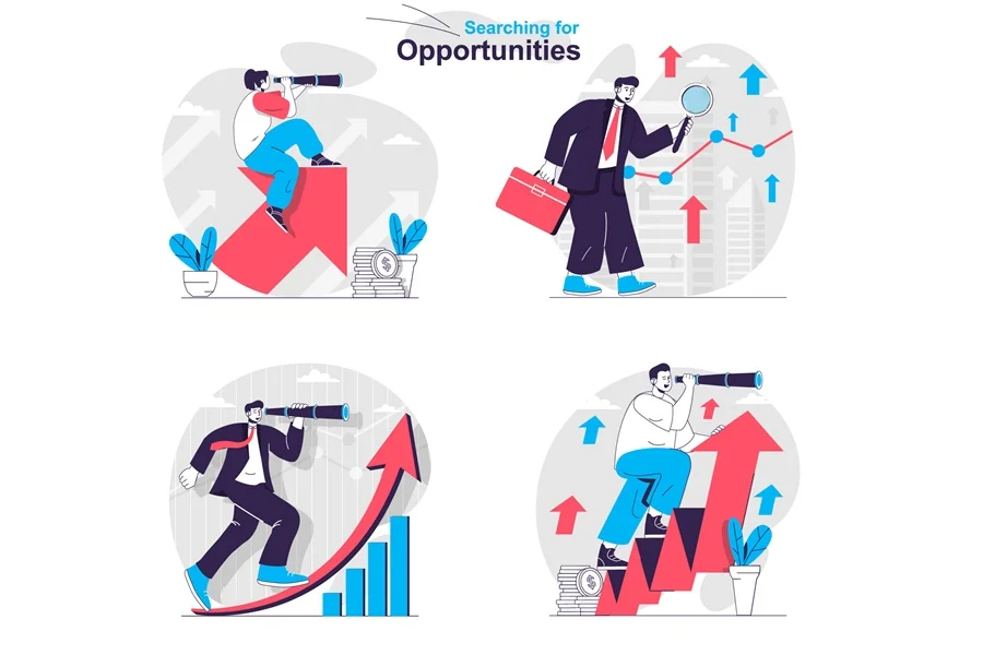 Download free: Searching opportunity concept set. Businessmen developing career and business. People isolated scenes in flat design. Vector illustration for blogging, website, mobile app, promotional materials.