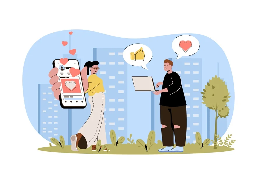 Download free: Social network web character concept. Man and woman users in social networks, communicate online from laptop or mobile app isolated scene with persons. Vector illustration with people in flat design