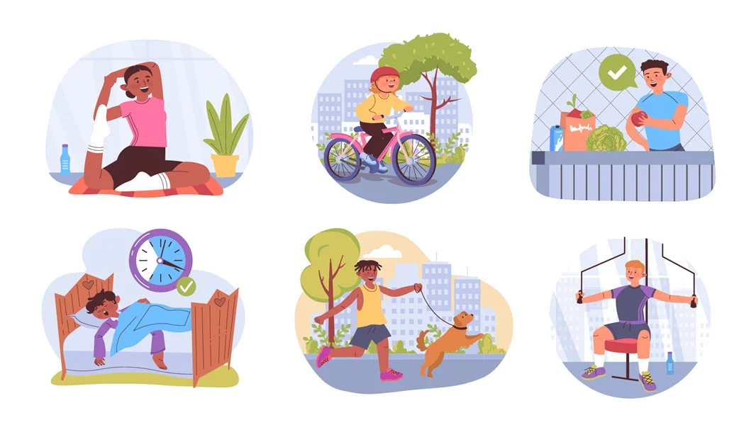 Download free: Healthy lifestyle habits concept set for web design. Collection with cartoon people doing trainings at gym, cycling bike, eating natural food and dieting, sleep, walking dog. Vector illustration.
