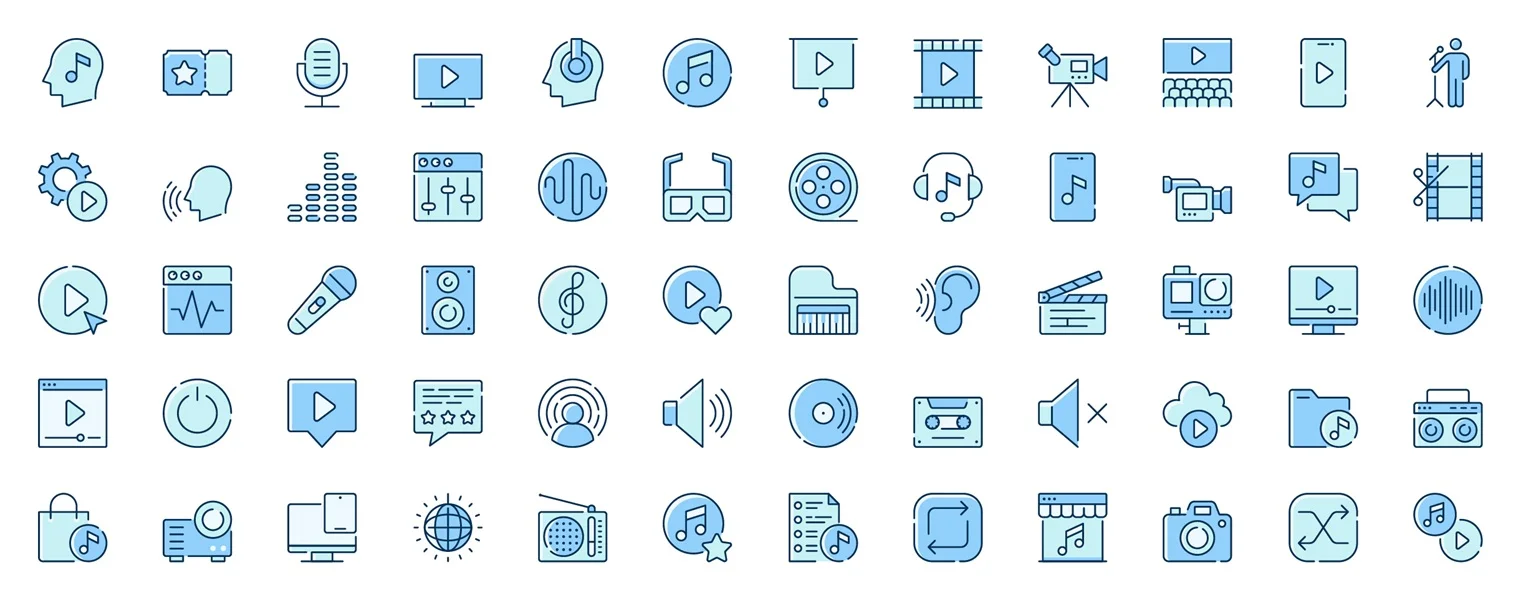 Download: Audio and Video web icons set in line design. Duotone pictogram pack of music, cinema ticket, microphone, headphones, melody, camera record, editing, more outline stroke signs. Vector illustration.