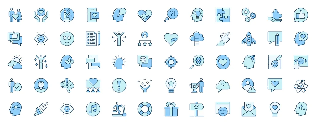 Download: Positive thinking web icons set in line design. Duotone pictogram pack of love relationship, support, meditation, mental health, brainstorming, vision, more outline stroke signs. Vector illustration.