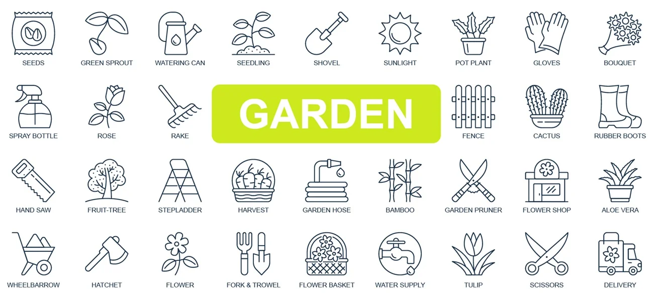 Download: Garden concept simple line icons set. Bundle of green sprout, watering can, seedling, shovel, gloves, pot plant, harvest, supply and other. Vector pack outline symbols for website or mobile app design