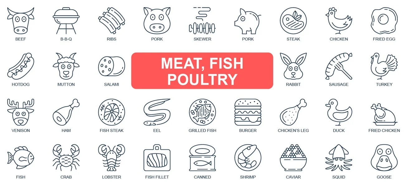 Download: Meat, fish and poultry concept simple line icons set. Bundle of beef, bbq, pork, chicken, hot dog, sausage, burger, shrimp, crab and other. Vector pack outline symbols for website or mobile app design
