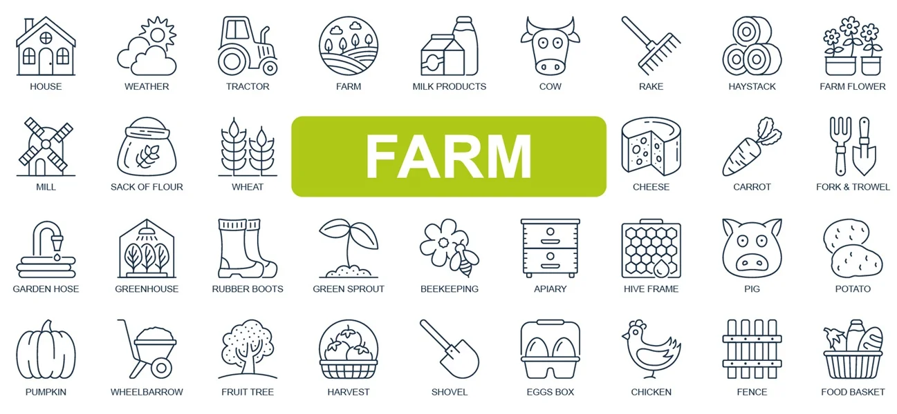 Download: Farm concept simple line icons set. Bundle of house, tractor, milk products, cow, cheese, carrot, garden, greenhouse, beekeeping and other. Vector pack outline symbols for website or mobile app design