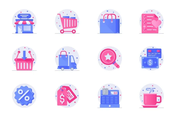 Download: Shopping concept web flat color icons with shadow set. Pack pictograms of store, delivery, order, payment, discount, sale, price and other. Vector illustration of symbols for website mobile app design
