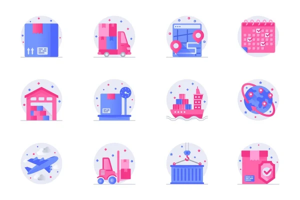 Download: Shipping concept web flat color icons with shadow set. Pack pictograms of parcel, delivery, tracking, warehouse, plane, truck and other. Vector illustration of symbols for website mobile app design