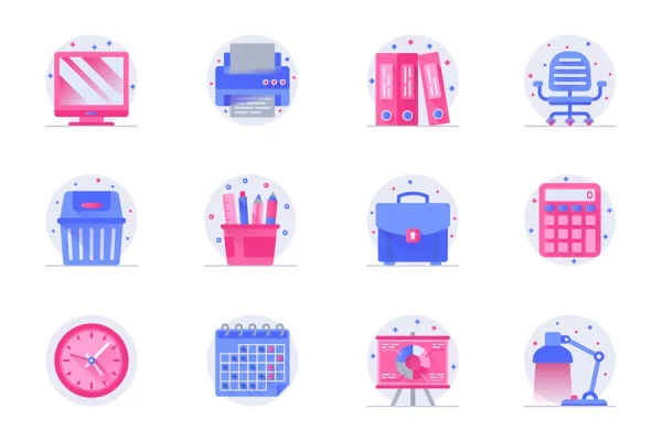 Download: Office supplies concept web flat color icons with shadow set. Pack pictograms of computer, printer, folder, chair, briefcase and other. Vector illustration of symbols for website mobile app design