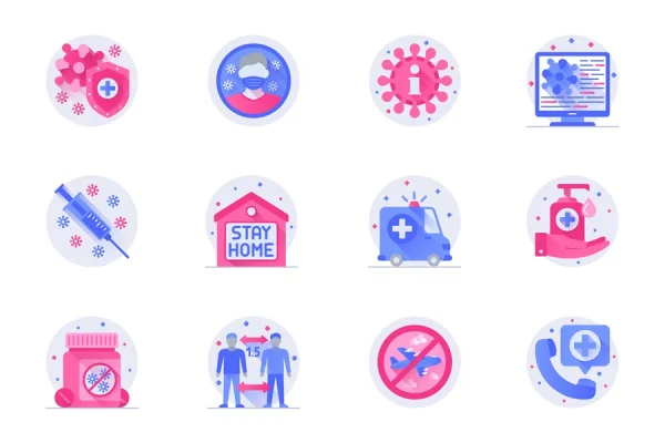 Download: Coronavirus prevention concept web flat color icons with shadow set. Pack pictograms of mask, vaccination, stay home, wash hands and other. Vector illustration of symbols for website mobile app design