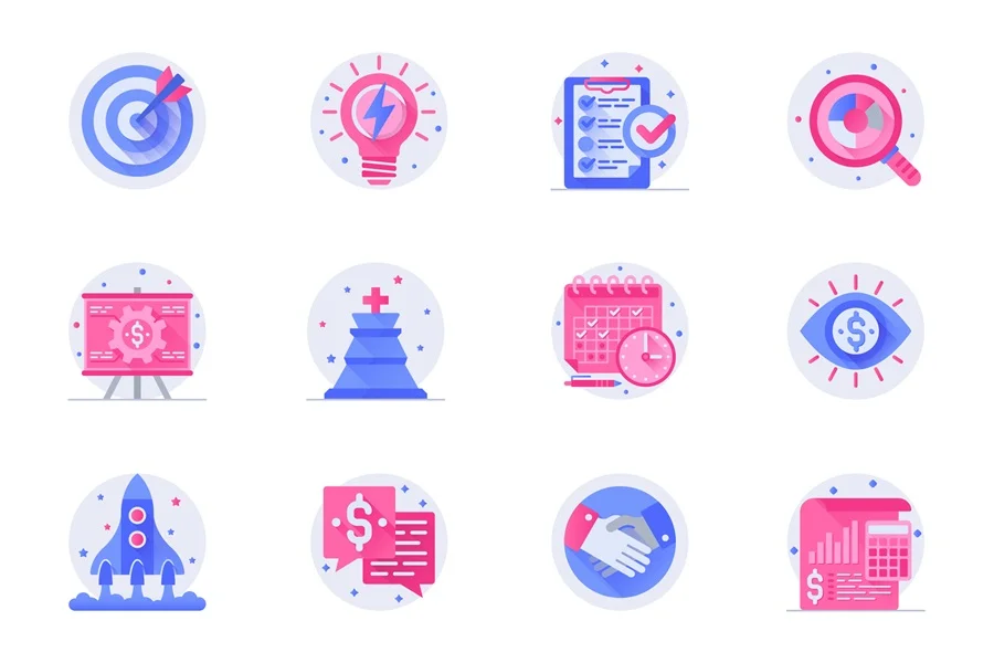 Download: Business planning concept web flat color icons with shadow set. Pack pictograms of target, brainstorming, task, search, profit and other. Vector illustration of symbols for website mobile app design