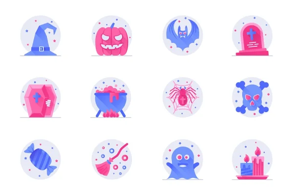 Download: Halloween concept web flat color icons with shadow set. Pack pictograms of witch hat, pumpkin, bat, cemetery, spider, skull and other. Vector illustration of symbols for website mobile app design