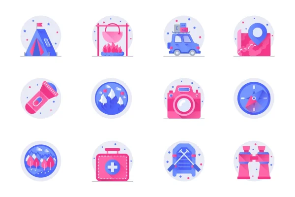 Download: Camping concept web flat color icons with shadow set. Pack pictograms of tent, campfire, car, map, route, flashlight, mountains and other. Vector illustration of symbols for website mobile app design