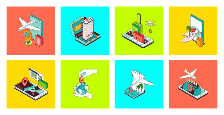 Download: Travelling concept of 3d isometric icons set. Pack with flight tickets online booking, hotel room reservation, global tourism, summer trip to sea beach resort, map navigation. Vector illustration.