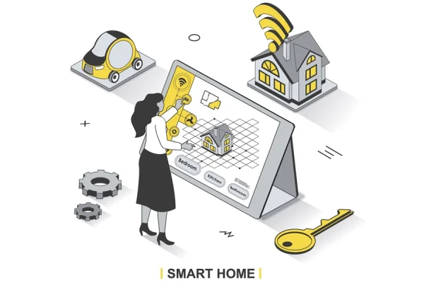 Download: Smart home concept of 3d isometric icons set. Pack with monitoring surveillance security system, wireless connection with electricity thermostats and different sensors in house. Vector illustration.