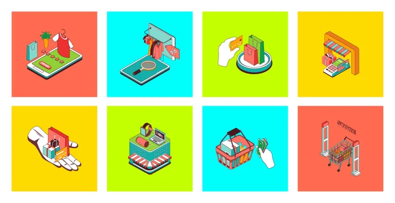 Download: Shopping concept of 3d isometric icons set. Pack with choosing and buying new clothes in online stores, customers making purchases at shops, paying credit card in supermarket. Vector illustration.