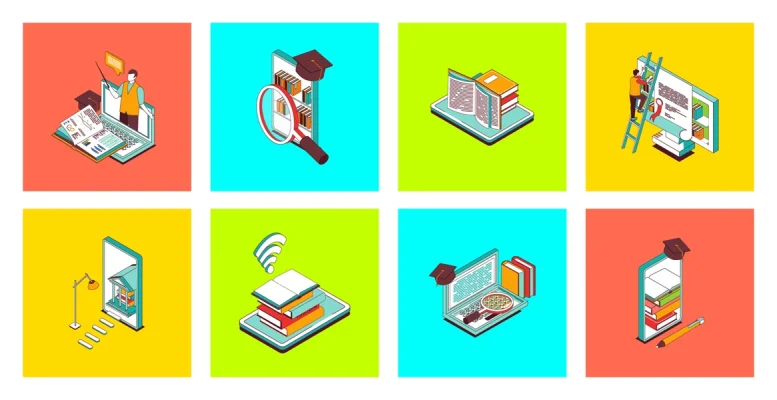 Download: Online education concept of 3d isometric icons set. Pack with distantly studying with teacher video lectures, college or university platforms, digital books read, virtual exam. Vector illustration.