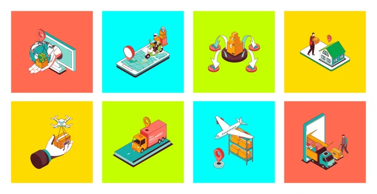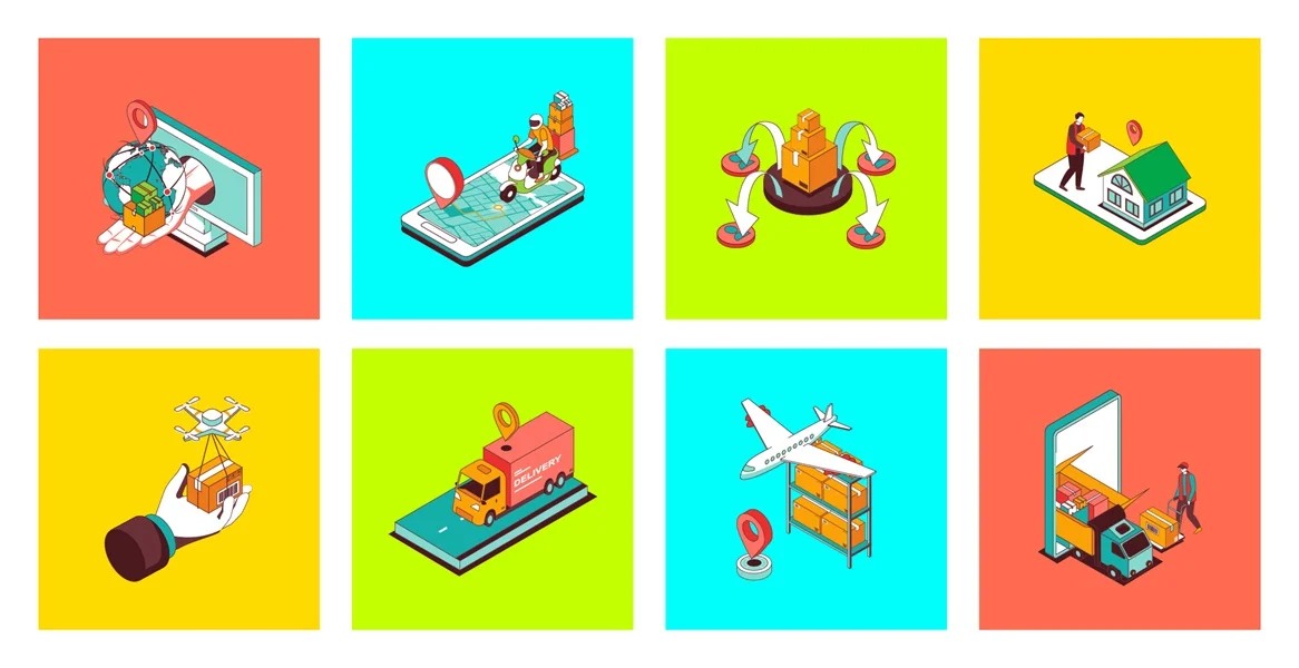 Download: Delivery concept of 3d isometric icons set. Pack with global logistics with warehouse, truck transportation, food delivering with drones and couriers, tracking parcels in app. Vector illustration.