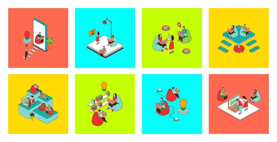 Download: Coworking concept of 3d isometric icons set. Pack with employees work in office space, coworkers doing tasks at workspace in workplace rooms, freelancers at startup teamwork. Vector illustration.
