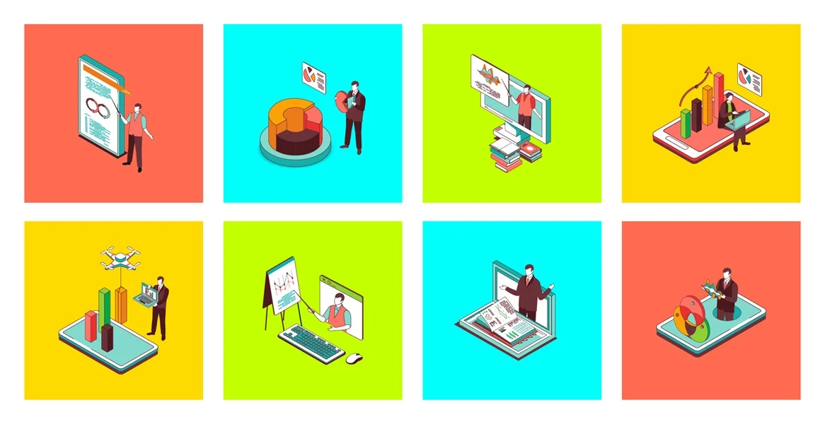 Download: Business training concept of 3d isometric icons set. Pack with learning at online coach conference with financial analysis presentation, consulting lectures and video seminars. Vector illustration.