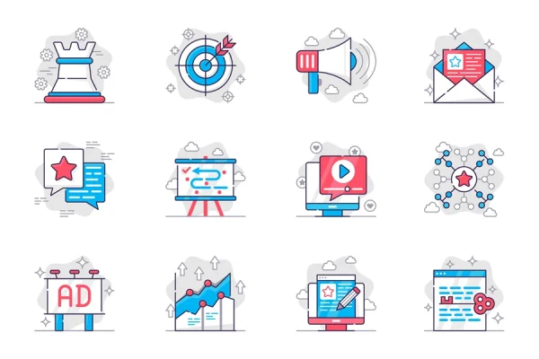 Download: Marketing concept flat line icons set. Successful business promotion strategy. Bundle of target, attraction, networking, optimization and other. Vector conceptual pack outline symbols for mobile app