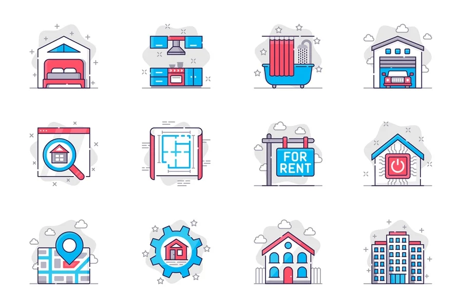 Download: Real estate concept flat line icons set. Buying or renting house or apartment. Bundle of bedroom, kitchen, bathroom, garage, blueprint, other. Vector conceptual pack outline symbols for mobile app