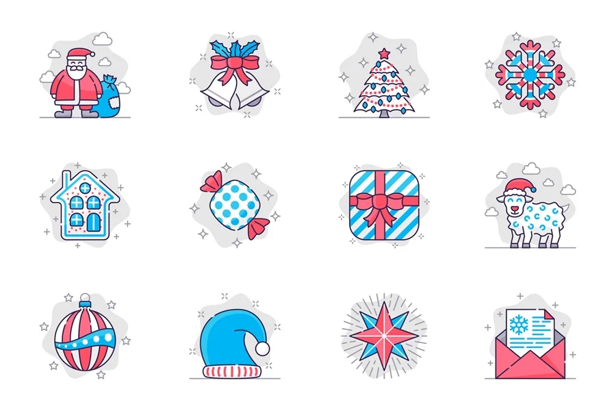Download: Christmas concept flat line icons set. Happy New Year, festive decor. Bundle of santa claus, bell, tree, snowflake, cookies, gift, sheep, other. Vector conceptual pack outline symbols for mobile app