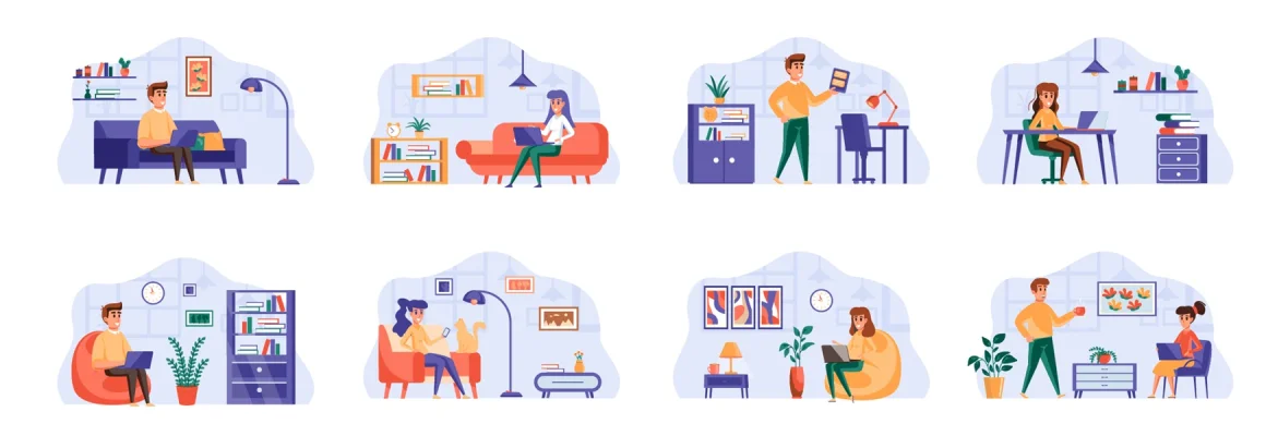 Download: Freelance work scenes bundle with people characters. Freelancers working and communicate at comfortable workspace situations. Distance working, self-employed occupation flat vector illustration.