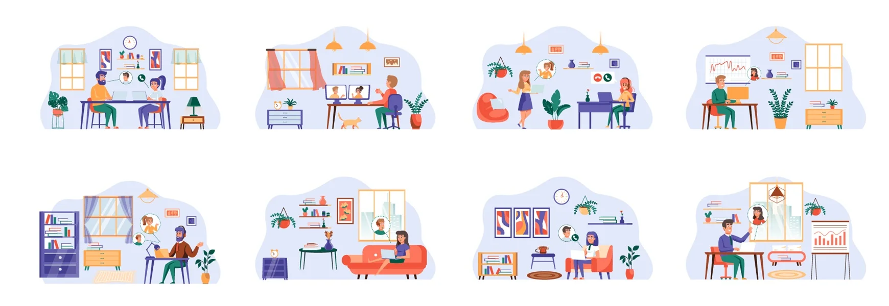 Download: Video conference bundle of scenes with flat people characters. Online talking, teleconference, video call conceptual situations. People communication online by computer cartoon vector illustration.