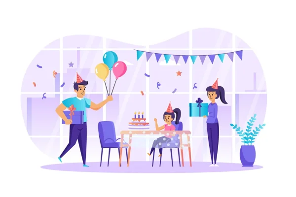 Download: Family celebrating birthday scene. Girl sits at festive table, cake with candles, mom and dad congratulate, give gifts. Kid home party concept. Vector illustration of people characters in flat design.