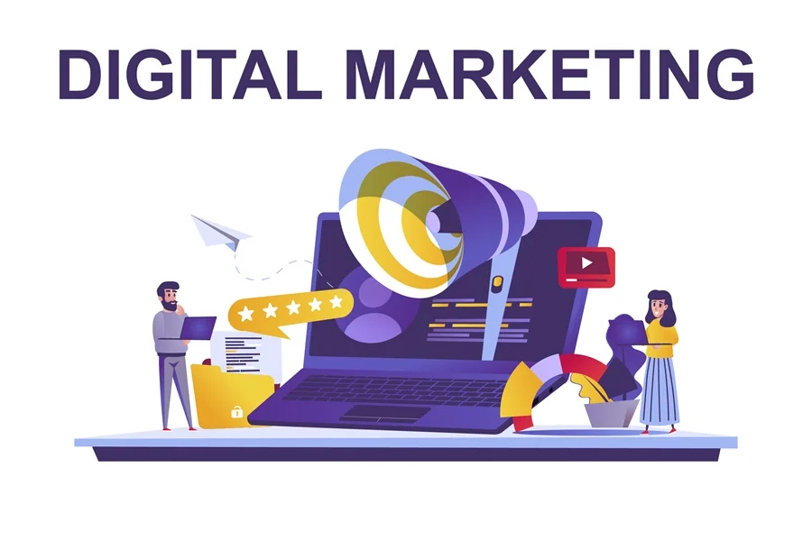 Download: Digital marketing web concept in flat style. People analyze marketplace, conduct advertising campaigns to promote goods, branding scene. Vector illustration of cartoon characters for website design.