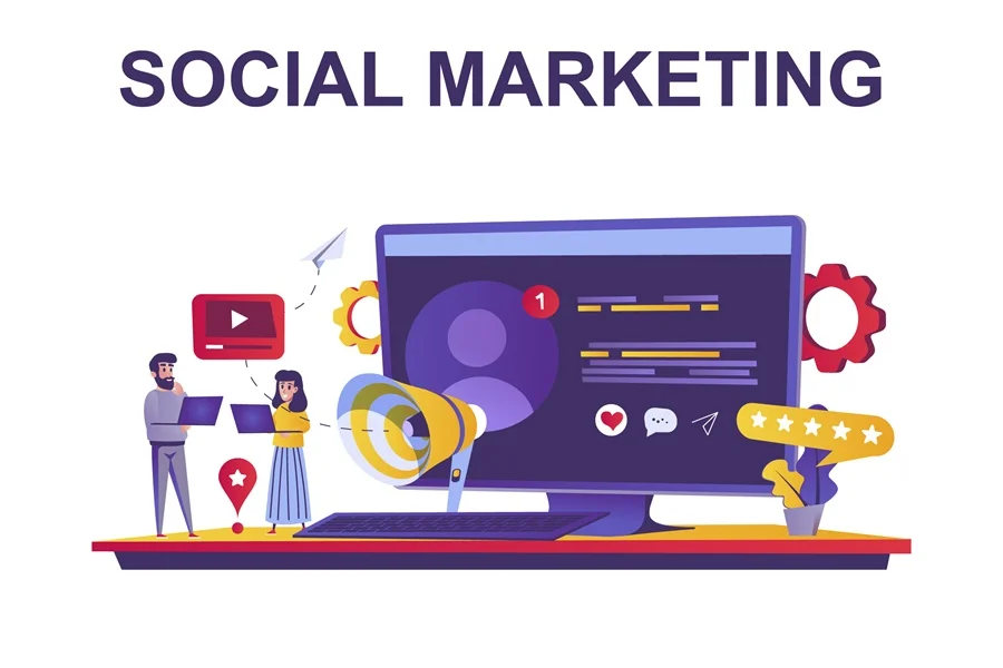 Download: Social marketing web concept in flat style. People promoting business on social networks, attract new buyers, clients communication scene. Vector illustration of cartoon characters for website design.