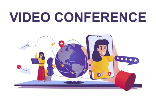 Download: Video conference web concept in flat style. People communicate online via video call from smartphone or laptop, modern technology scene. Vector illustration of cartoon characters for website design.